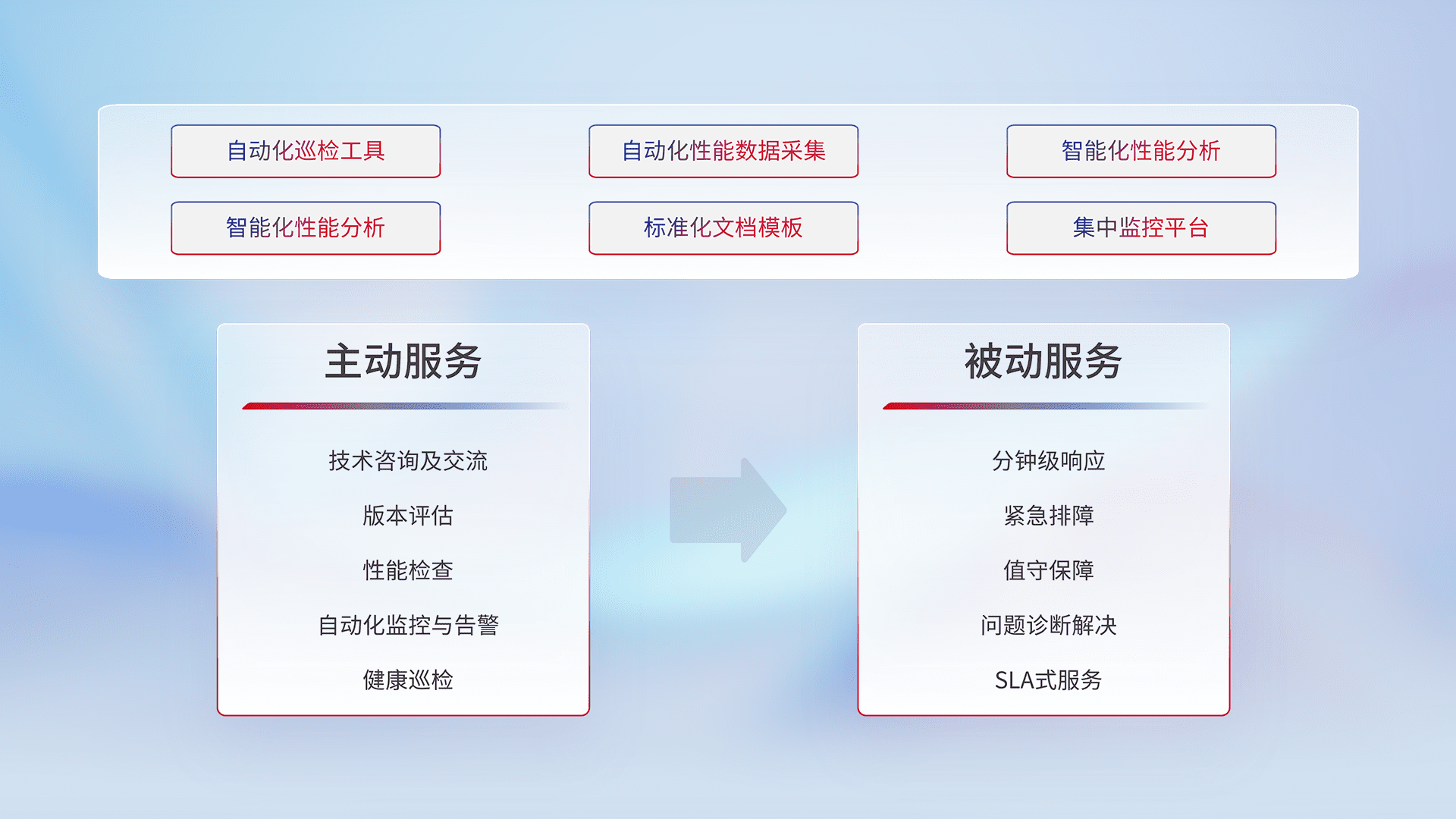 智能化工具和标准化文档,,,保障服务质量,,提供主动服务(包含技术咨询、、、版本评估、、、性能检查、、、、自动化监控与告警、、、、健康巡检)和被动服务包含(分钟级响应、、、、紧急排障、、值守保障、、问题诊断解决、、、SLA服务)。。。。